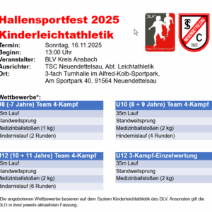 Mit rund 200 gemeldeten Kindern, veranstalteten die TSC Abteilung Leichtathleten am 16.11.25 das jährliche Hallensportfest im Alfred-Kolb-Sportzentrum. Zusammen mit den Gastvereinen SPS TuS Neusorg, TuS Feuchtwangen Leichtathletik, TSV Ochenbruck Leichtathletik, Leichtathletik Altdorf, DJK Abenberg, TV Heilsbronn und TSV 1860 Ansbach Leichtathletik stellten sich alle Kinder den Disziplinen Standweitsprung, Weitwurf, Sprint und dem Hallencross in Einzel- und Mannschaftswertungen. Das habt ihr alle super gemacht Das Trainer- und Organisationteam der Leichtathleten bedankt sich bei allen Helfern in Weiterlesen